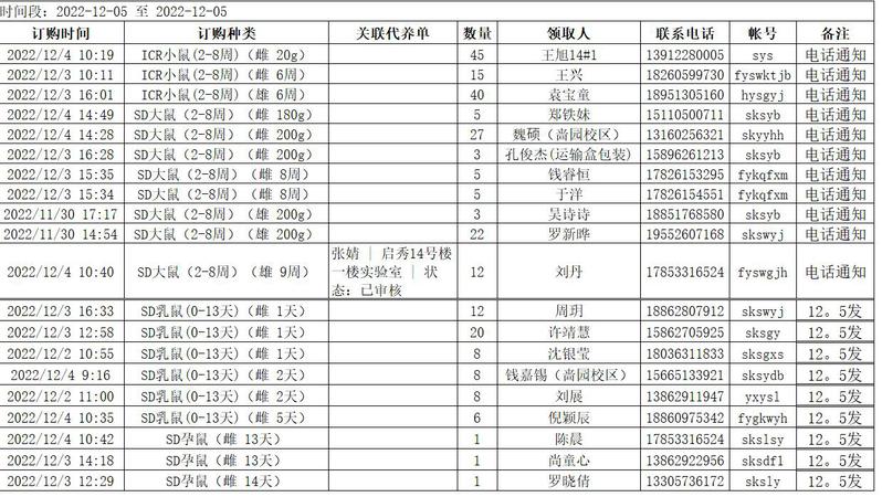 12月5日实验动物中心动物发放表