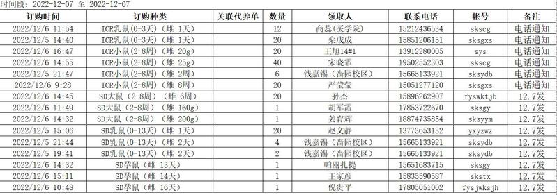 12月7日实验动物中心动物发放表