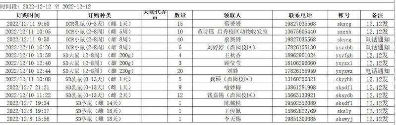 12月12日实验动物中心动物发放表