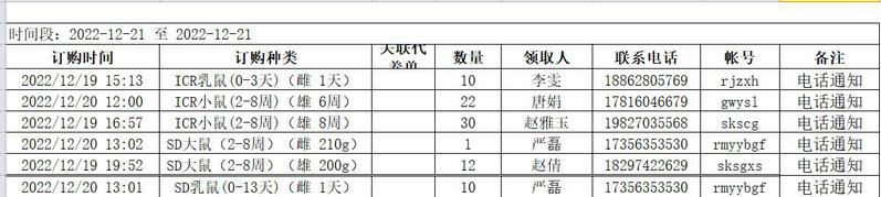 12月21日实验动物中心动物发放表