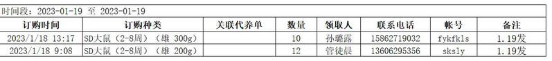 1月19日实验动物中心动物发放表